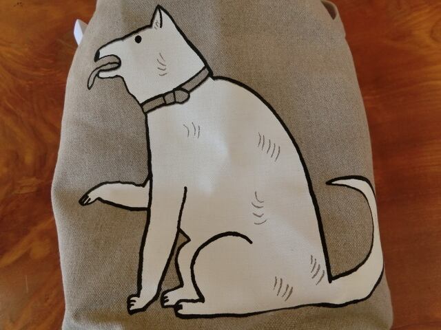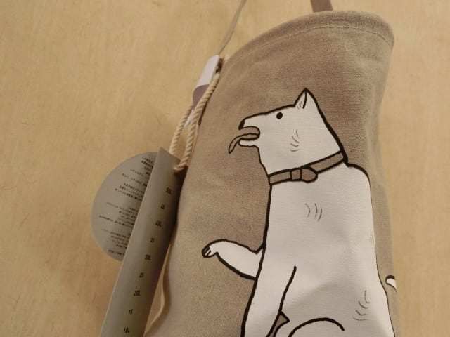 お手をする白い犬と、困り顔のブルドッグが大変キュートなリネンのバッグです。