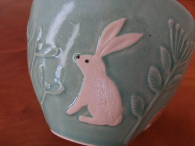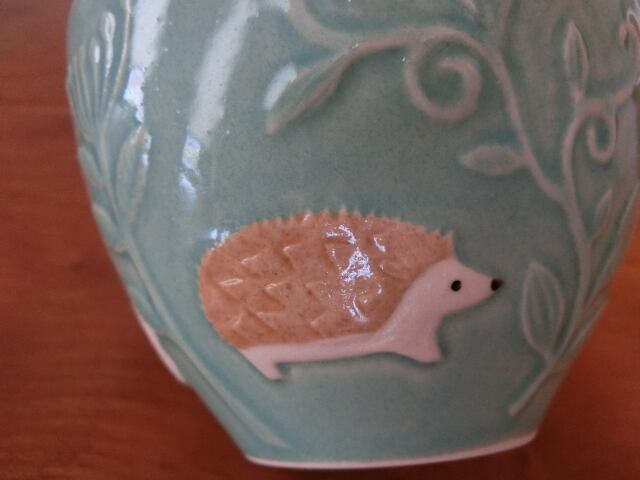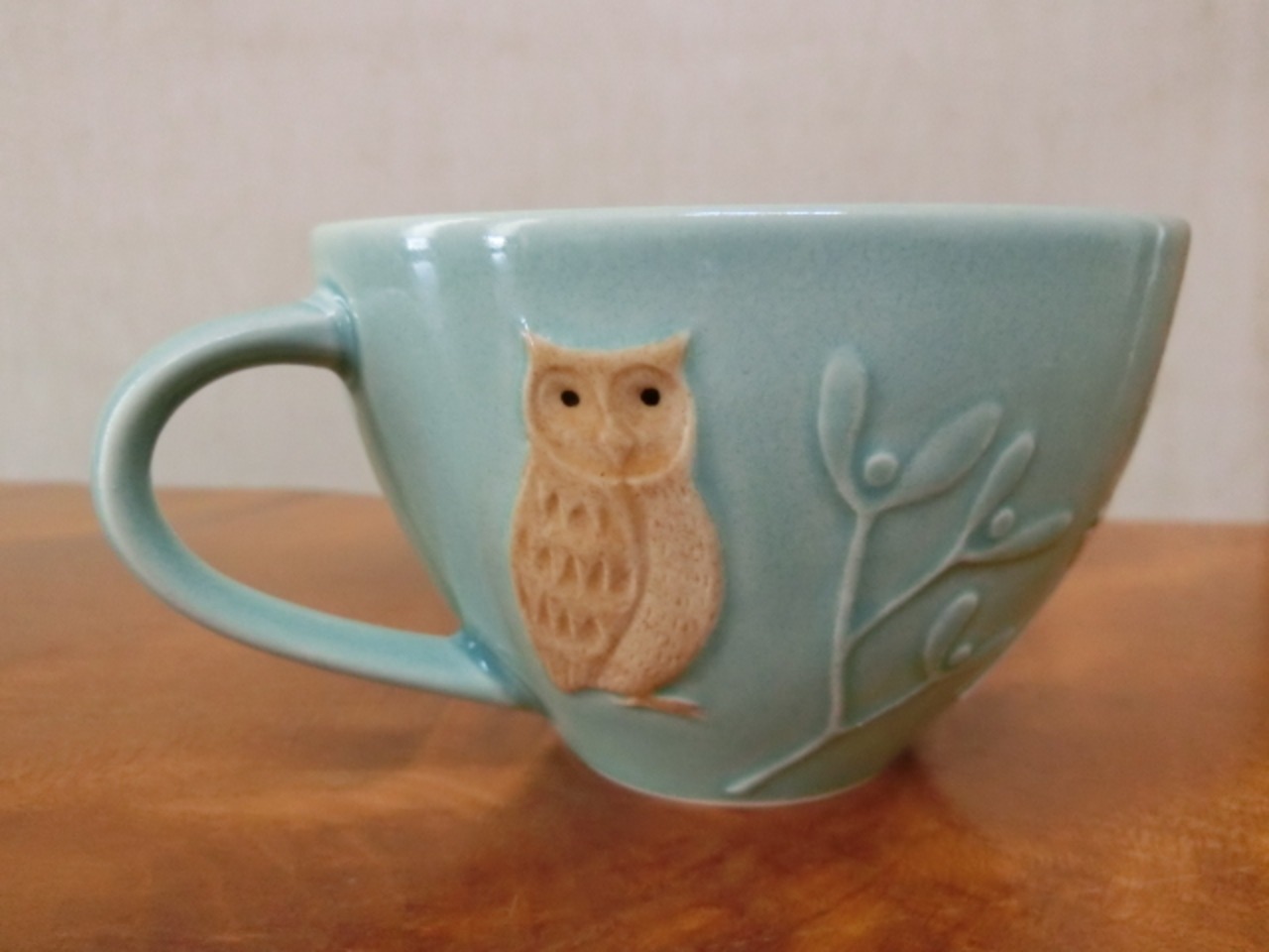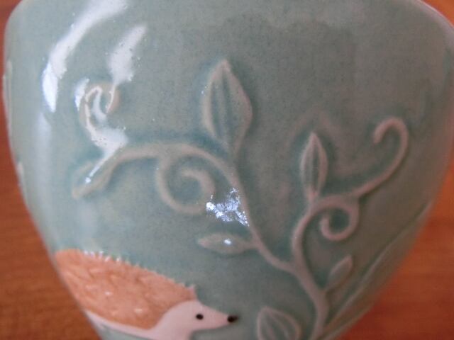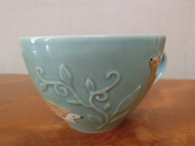 胴回りに、ふくろう、シカ、はりねずみ、うさぎ、草木模様が施されたマグカップです。