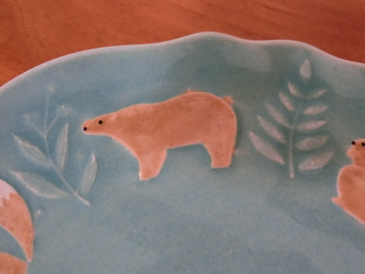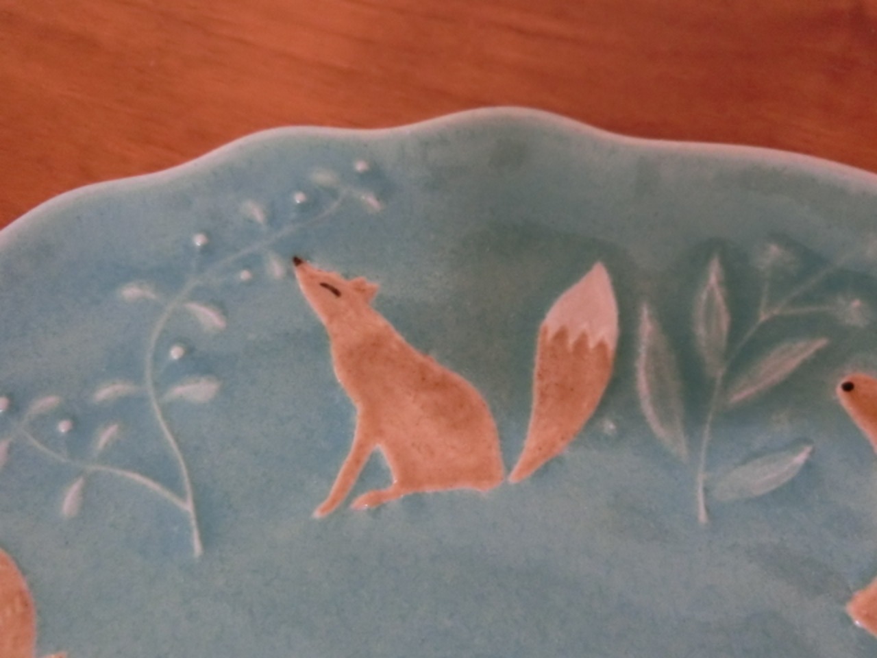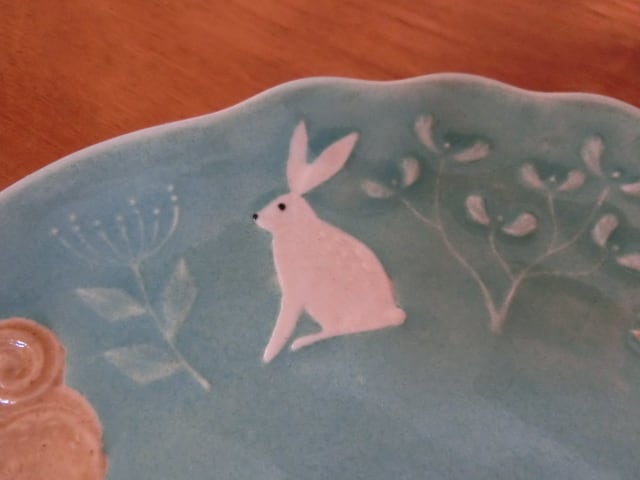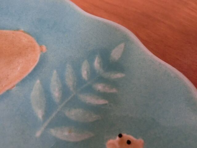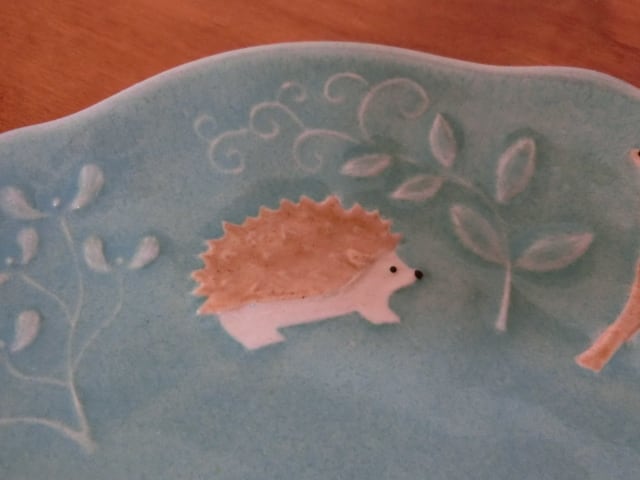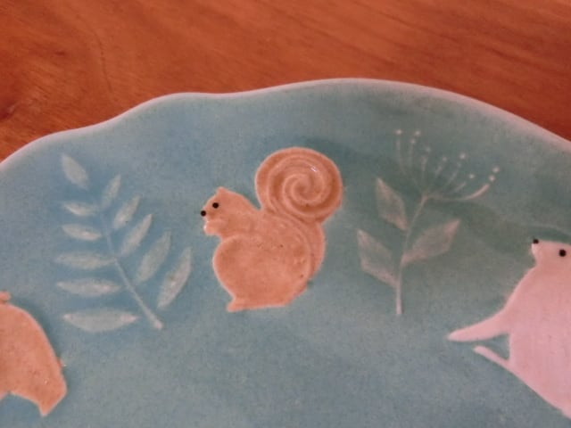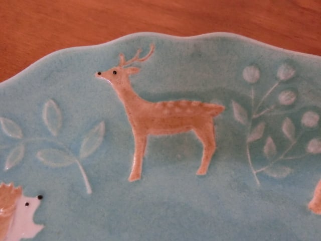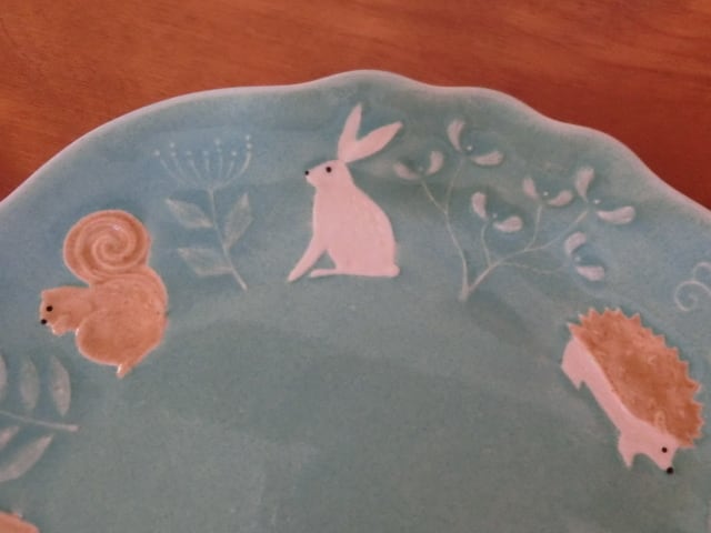 うさぎ、ハリネズミ、シカ、ふくろう、キツネ、クマ、りす、草木模様が施された楽しいプレートです。比較的フラットな形状ですので、ケーキ皿におすすめです。