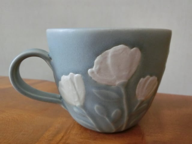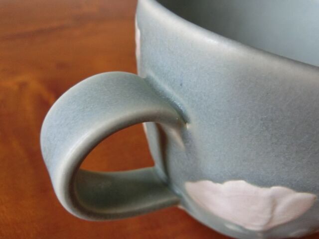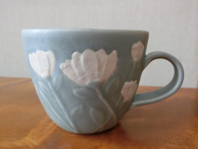 ぽってりしたフォルムのマグカップで、白い花模様がロマンチックです。