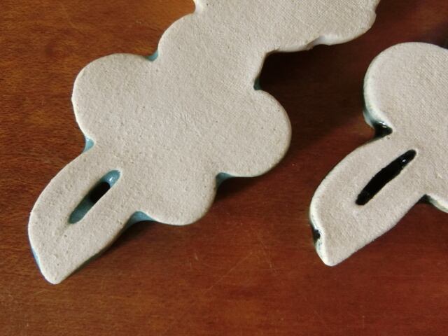 お色は花部分が少し光沢のある月白、四つ葉部分が、ベルベットグリーンと、レイクグリーンです。