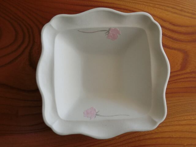 2か所に、淡いピンクのスイートピーの花が施されたエレガントな四方鉢です。