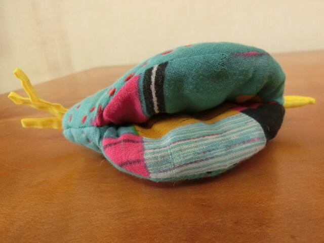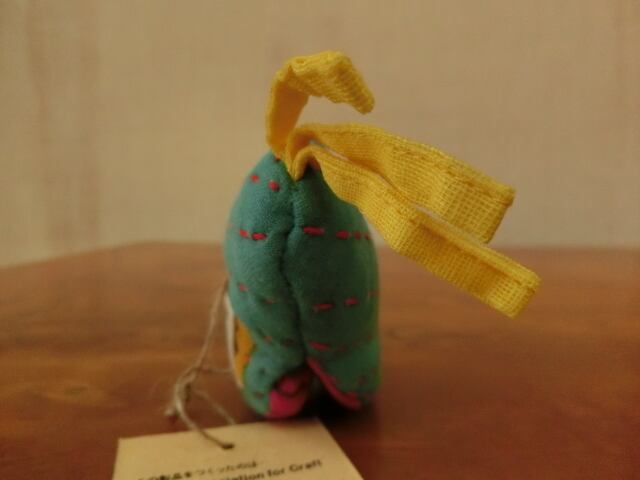 目はココナッツボタン、本体はリサイクルサリー(コットン)で作られています。